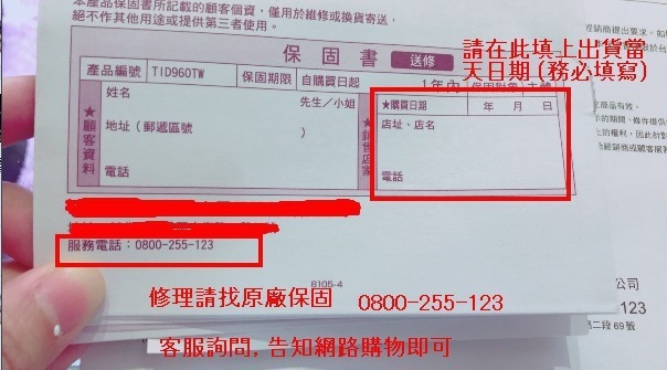 請務必在保固書上面填寫當天出貨日期